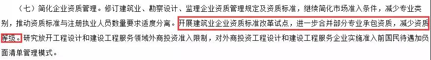 《2018年工作要點》中明確表示:繼續(xù)簡化市場準入條件,減少專業(yè)類別;開展建筑業(yè)企業(yè)資質標準改革試點,進一步合并部分專業(yè)承包資質,減少資質等級。