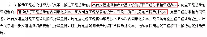《2018年工作要點》指出:推進工程總承包,出臺房屋建筑和市政基礎設施項目工程總承包管理辦法。